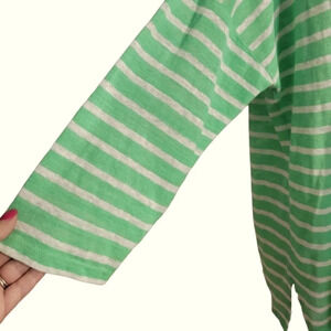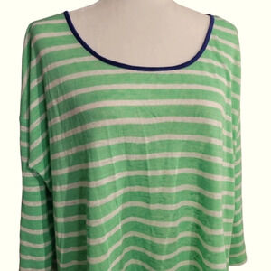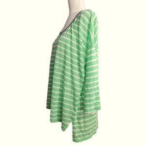 Nautical inspired elevated striped tee with high/low step hem and three-quarter sleeves. Lightweight and breathable.
