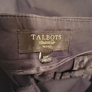 Talbots black capris. The capris have a side zipper and pockets on the back. The pants are in great condition. Fabric content is 97% cotton and 3% spandex. Waist: 33" Inseam: 22" Rise11"