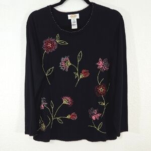 TALBOTS Black Embroidered Floral Beaded Lightweight Sweater, Size 1X. Lovely, vibrant floral embroidery on front and back. Beaded detail along neckline, hem, and sleeves. Gently pre-owned in excellent condition.