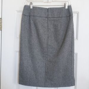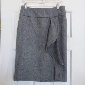 Power suit with a feminine touch! Black and ivory tweed (technically, up close, the pattern is very thin stripes, but like like tweed from a distance.) Wool blend, great for Fall and Winter, but could easily be worn in the Spring or Summer. Classic pencil skirt silhouette, knee length. Cascading fabric down the side, ruffle like. Concealed back zipper. Darted at waist in back for a tailored fit. Fully lined. Waist 28" Length 23 5" Excellent condition, like NWOT.
