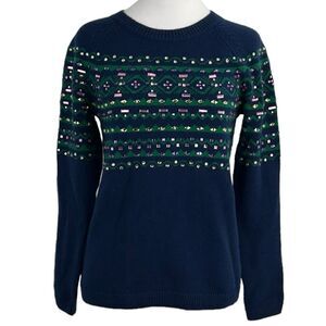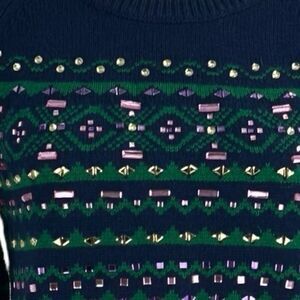 TALBOTS Blue Green Jeweled Crystal Embellished Sweater S Petite Lambswool Blend