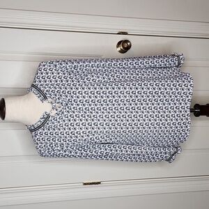 Blue and white grosgrain ribbon trim on neckline and sleeves
