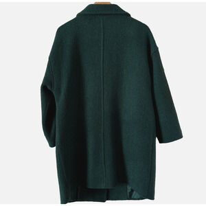 Cozy forest green boucle wool blend coat with a high neck collar and relaxed oversized silhouette. Features large buttons and large chore pockets. Perfect fall and winter layering for an effortless and elegant look!
