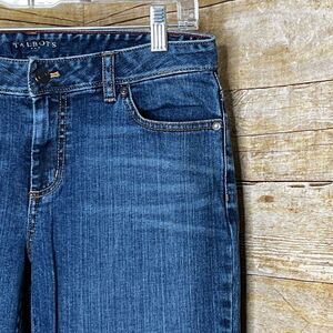 TALBOTS CLASSIC FIVE POCKET ESSENTIAL SIGNATURE BOOTCUT JEANS WITH ZIPPER FLY AND BUTTON CLOSURE. JEANS OFFER SOME STRETCH. JEAN HEMS HAVE LITTLE FRYING AT THE BOTTOM. OFFERS WELCOME