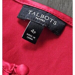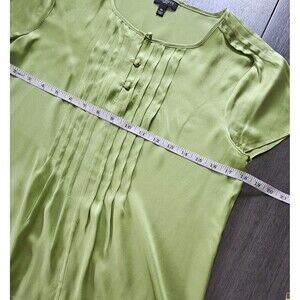 The product is a lot of two Talbots Chartreuse Green and Red Pin Tuck Silk Blouses in size 4 petite. These solid green blouses feature a round neck, short sleeves, and a classic fit. Made from 100% silk, they are perfect for a career-oriented occasion and are designed with a cap sleeve style. This lot includes two stylish and sophisticated blouses from the reputable brand Talbots, catering to women who prefer a petite size. See pictures for measurements