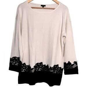 Talbots Sweater Womens Large PETITE Ivory Black Lace Trim Pullover Cotton Blend