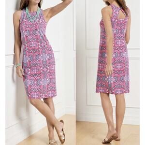 The Talbots Effortless Jersey Medallion Open Back Dress is a stylish and comfortable option for petite women. This sleeveless shift dress features a beautiful medallion pattern in a lightweight and stretchy jersey fabric. The open back adds a touch of sophistication, while the knee-length hem makes it perfect for various occasions. With its pink color and wrinkle-resistant material, this dress is a versatile and flattering choice for any wardrobe.