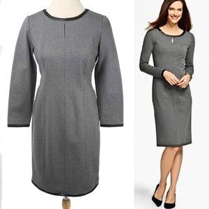 Fabulous Talbots heathered gray ponte stretch knit sheath career dress with black faux leather trim details. Keyhole under the front neckline. Knee length, long sleeves & exposed back zipper. Unlined. Excellent condition - worn once.