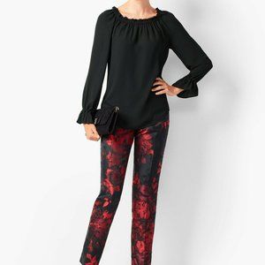 These gorgeous pants by Talbots RSVP collection feature- a slim ankle fit-narrow from the knee to hem and slim through the hip and thigh, ankle slits, hidden side zipper closure. Flat front, sits at waist, floral print, and back welt pockets.