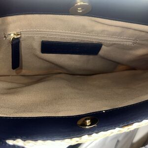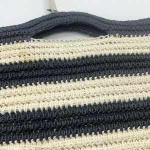 Paper straw handbag that had been hand crocheted with blue and white stripe pattern and pineapple detail, double handles, snap closure, fully lined with interior zip pocket. Small glue marks on backside near handle (see pictures) but otherwise New With Tags. Measures 13”W x 10”H x 1”D with a 2” strap drop.