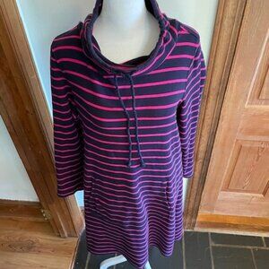 TALBOTS Hello Saturday Long Sleeve Knit Drawstring Neck Dress Navy Strip…