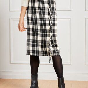 TALBOTS Ice White & Black Plaid Fringe Faux Wrap Skirt