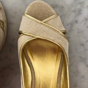 TALBOTS Linen Gold Cross Toe Jute Slingback Wedge Sandals 9 1/2M