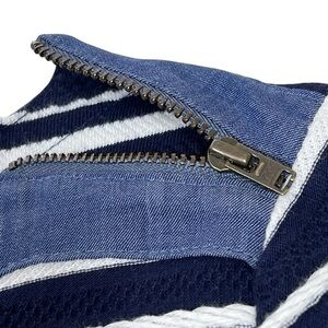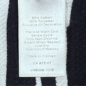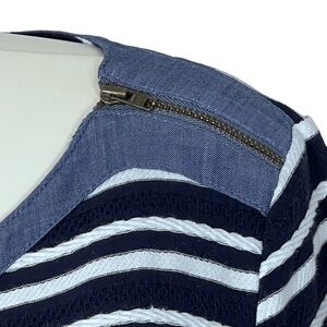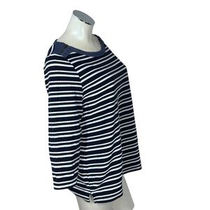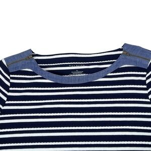 This Talbots Navy Blue & White Striped Harbor Top is a timeless blend of classic nautical style and modern detail. Crafted from a soft cotton-poly blend, it offers both comfort and durability for all day wear. Featuring a round neckline with denim blue accent trim and small shoulder zipper accents. The 3/4 sleeves and side slits provide ease of movement and a relaxed, yet polished fit.
