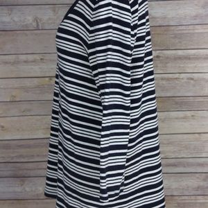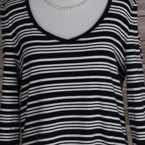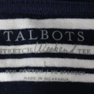 TALBOTS Navy and White Nautical-Inspired Striped 3/4 Sleeve "Stretch Weekend Tee" Women's Top, Size Large. This comfortable top has a navy and white nautical-inspired striped pattern, rounded v-neckline, bottom side slits, 3/4 sleeves, and a subtle hi-low design element. The material is 93% Cotton and 7% Spandex. The approximate measurements are as follows: Length = 25.5", Bust = 38", and Arms (Outer Seam) = 19"/(Inner Seam) = 12".