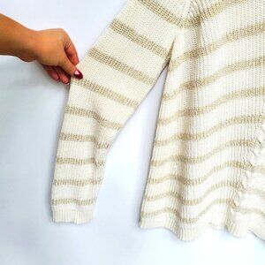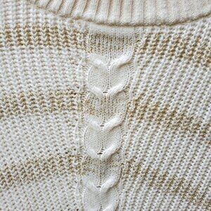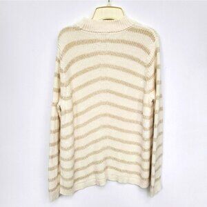 You will wear this all fall and winter! Cream striped sweater by Talbots. Oversized. Drop Shoulder. Mock neck. Cotton blend. Gold threads, metallic sheen. Great thick knit, with cable knit design down middle. Ribbed neck, hem and cuffs. Stripes are at a figure flattering angle, front and back. Size 1X. Gorgeous Quality Piece to add to your wardrobe! Like New!