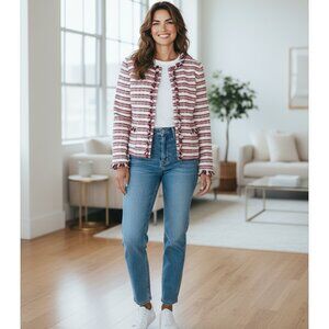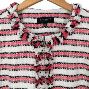 TALBOTS Pink/White/Black Stripe Cotton Fringed Zip Jacket