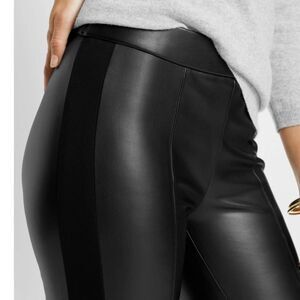 Modern faux leather legging with a side zip for easy on-off. Designed with a ponte knit side panel for comfort and a flattering fit.