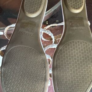 Chic metallic silver sandals by Talbots. Features elegant strappy design. Ideal for versatile styling.