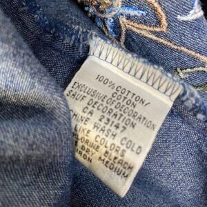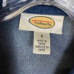 TALBOTS Size 8 Embroidered Blue Denim Shirt. The embroidery is gorgeous. 100% cotton. Has a good weight to it. Small spot on shoulder, otherwise, good pre-owned condition. Fragrance may be present from laundry products or use.