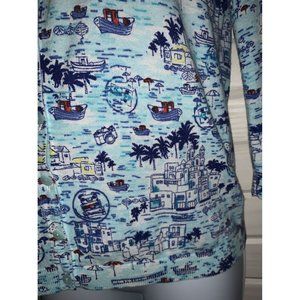 TALBOTS Sz ?? (See Meas) Blue Boating Scene Cotton Button Front Cardigan EUC