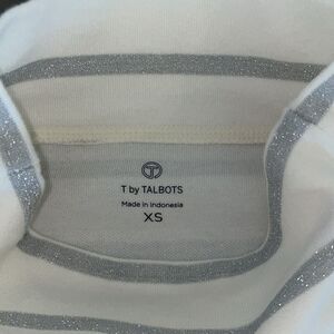 Excellent condition, Talbots T by Talbots Supersoft Jersey Mockneck Tee with metallic tail Trail stripe in size small XS. Color cream with gray metallic stripes.  76% cotton, 18% polyester, 3% metallic and 3% other fiber – machine wash cold. See pictures for length and armpit to armpit measurements.