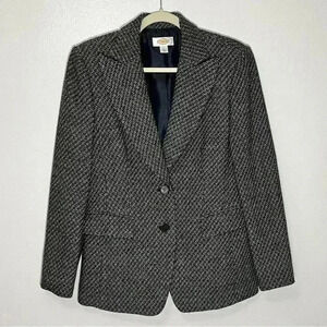In good preloved condition. Size 6. Has function flap pockets. Shell 100% wool. Lining is 100% polyester. Black and white. Dry clean only.