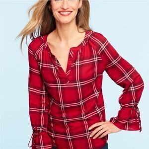TALBOTS V-Neck Plaid Blouse Red 1X like new condition 100% Cotton tie sleeve
