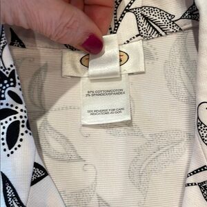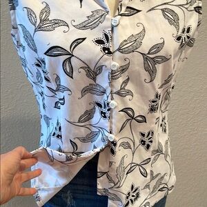 This sleeveless blouse features a striking black print on a crisp white background, offering a bold and stylish look. The fitted design with a notched collar adds a touch of elegance, making it a perfect choice for warm weather occasions. New without tags