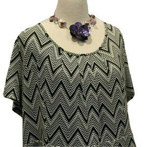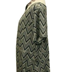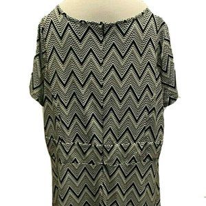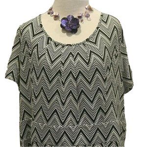TALBOTS Woman Size 1X Black & White Geometric Print Short Sleeve A-Line Dress. This dress has a black and white color hue, geometric print, rounded gathered neckline, short sleeve, A-line cut, and a back zipper and hook & eye closure. The material is 92% Nylon and 8% Spandex. The approximate measurements are as follows: Length = 38.5", Chest = 46", Waist = 42", and Hips = 56". All measurements are approximate and taken with the garment laying flat. Accessories sold separately.