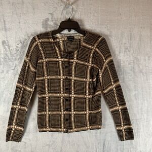 TALBOTS Women's 100% Merino Wool Cardigan Button Up Tan Black Geometric Preppy Old Money S