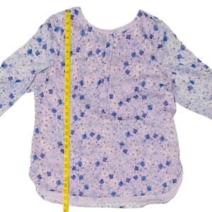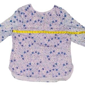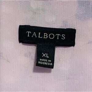 Talbots size XL Lilac or Lavender Purple Floral Print Pullover Top. Hidden button front closure. 3/4 sleeves. Fabric has a texture to it as shown in photo. Hidden button placket closure. Body is lined, sleeves are unlined. 100% polyester. Good pre-owned condition.