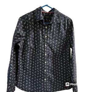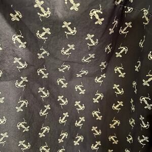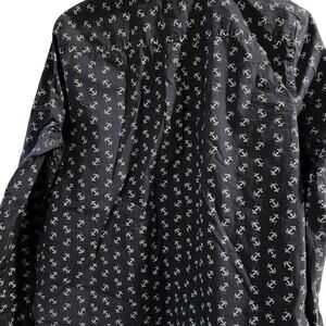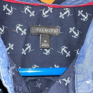 Preowned- nice condition. Navy blue Talbots anchor roll tab shirt. Button front and rollup/ button sleeves. Anchors print on cotton fabric. Size 14 women’s.