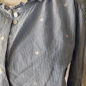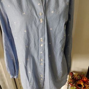 Talbots ruffle band collar. Long sleeves. Embroidered white polka dot. Button front. Mint condition with no defects.