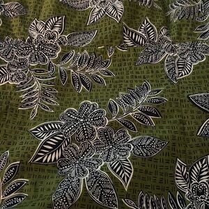 Cute for summer vacation! The faux wrap top is olive green with black and white florals. It is a pullover and has a size zipper -9”-for ease of dressing. There is a seam under the bust. All cotton with a touch of spandex for some stretch. Boxy.