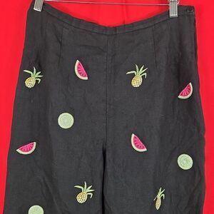 Black linen cropped pants with embroidered fruit watermelon, lime and pineapple