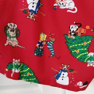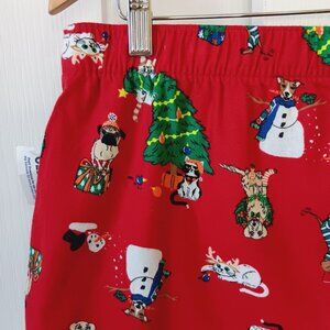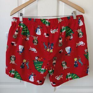 Red flannel boxer shorts with all over Christmas print. Print features dogs and cats doing various holiday and winter activities. Dog wearing socks and a wreath. Cat wearing antlers. Cat wearing Santa hand and neckerchief sitting by Christmas tree. Dog wearing striped PJs wearing mistletoe and looking at gifts.