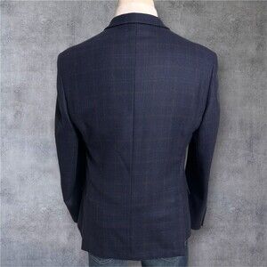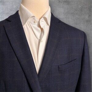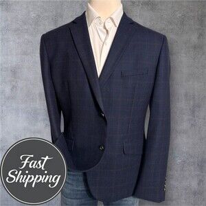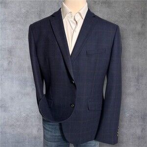 TALLIA Mens Blazer Sport Coat Two Button Jacket 44R Wool Blue/Navy Windowpane
