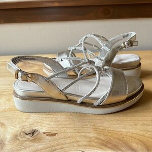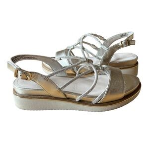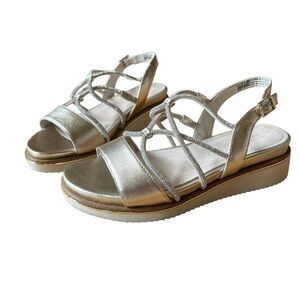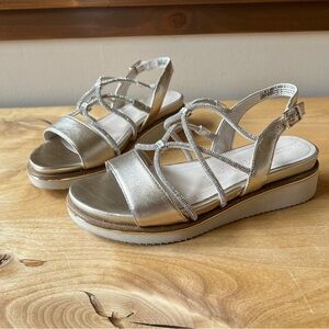 Womens US size 7, LIGHT GOLD leather and textile blend upper, round toe, adjustable buckle strap, low wedge heel, rubber outsole, silvery crystal bling.