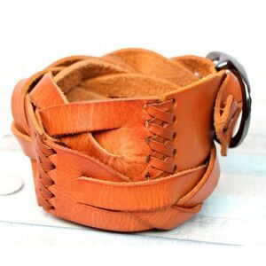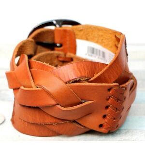 TAN BROWN GENUINE LEATHER 2"Wd STITCHED WOVEN CASUAL WOMEN'S BELT Sz L (29D