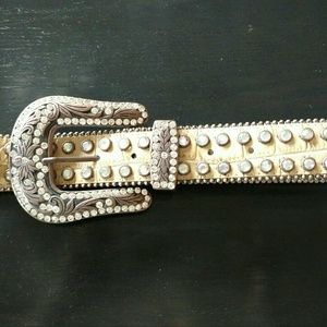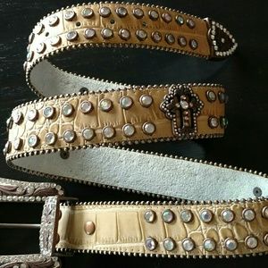 Tan 1 1/2" leather, embossed gator print belt with iridescent crystals and copper tone cross shaped embellishments, ball edging and removable buckle. An awesome addition to your wardrobe! New/never worn