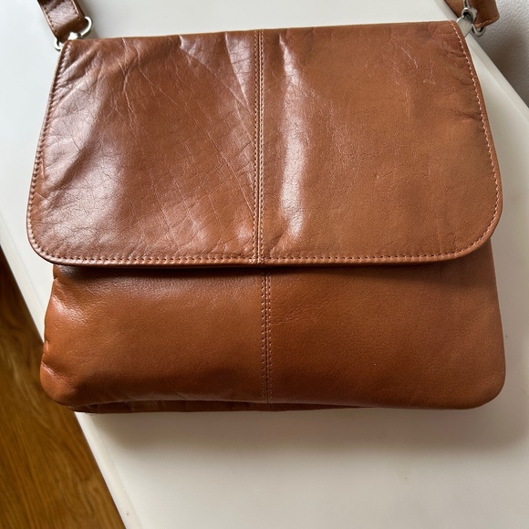 SOFT TAN LEATHER NEW WITH TAG -FULLY LINED LEATHER CROSSBODY BAG - 100% LEATHER, PRETTY FABRIC LINED. STRAP ADJUSTS 13-26". APPROX MEASURE - 10" ACROSS X 0.5 X 9 1/2" HIGH. TOTAL OF 4 COMPARTMENTS - 2 ZIPPERED PLUE SMALL INSIDE ZIP. ONE IS SNAP/FLAP COMPARTMENT. OTHER IS JUST AN OPEN SLIDE IN. UNUSED.