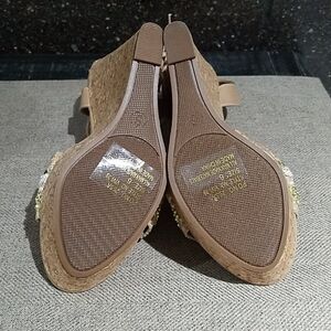 TAN NEUTRAL BEADED SANDAL CORK WEDGES ANKLE STRAPS