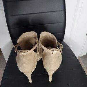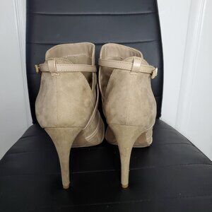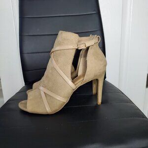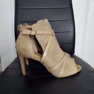 Tan suede peep-toe booties feature soft leather crisscross straps and a slim stiletto heel for a flattering, feminine silhouette. Perfect for the fall with a mix of structure and softness, transitioning beautifully from day to night.