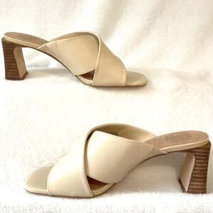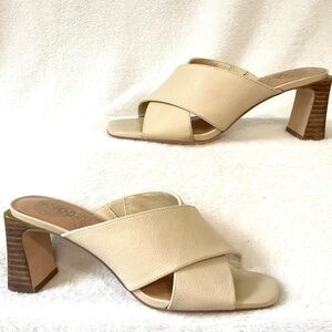 TAN VINCE CAMUTO HEMILA LEATHER CROSSOVER SLIP ON BLOCK HEEL SANDAL SZ 7.5M/38