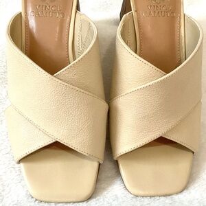 TAN VINCE CAMUTO HAMILA LEATHER CROSSOVER SLIP ON OPEN TOE BLOCK HEEL SANDAL SIZE 7.5 M