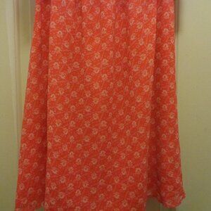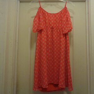 TANGERINE DREAM & WHITE OFF SHOULDER MINI DRESS M. THIS IS SUCH A GREAT LITTLE DRESS. IT WAS MADE IN CHINA. IT IS 100 % POLYESTER. IT DOES NOT HAVE ITS TAGS. IT HAS A EMPIRE WAIST. IT HAS 3 METAL BUTTONS. ALL THE WAY AROUND THE ELASTIC EMPIRE WAIST IS 28 INCHES. WITH LIGHT WEAR YET PLENTY TO SHARE WITH YOU LUCKY BUYER. FROM THE TOP OF THE DRESS TO THE BOTTOM IS 33 INCHES. 4TH GROUP. #407. ALSO EB. THANKS