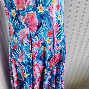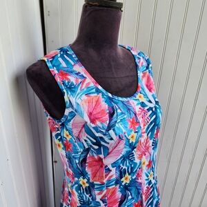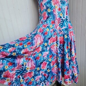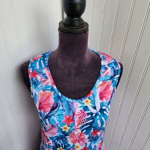 TANGO MANGO $99 Stretch Pin Tuck Floral Casual Tank Dress Monstera Blue Pink S