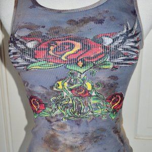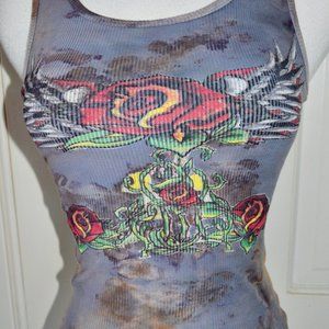 TANK TOP FADED PURPLE TATTO PRINT ROSES RED & BLUE COTTON RIB FITS SMALL