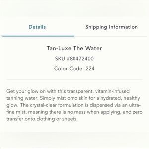 This completely color-free vitamin-infused tanning water combines purified water, vitamins B, C, and E, raspberry seed oil, aloe vera, and organic tanning actives to illuminate and hydrate. Exclusive Triple Tan Technology combines a blend of organic tanning actives, which work with skin to deliver an undetectable, stain-free tan.